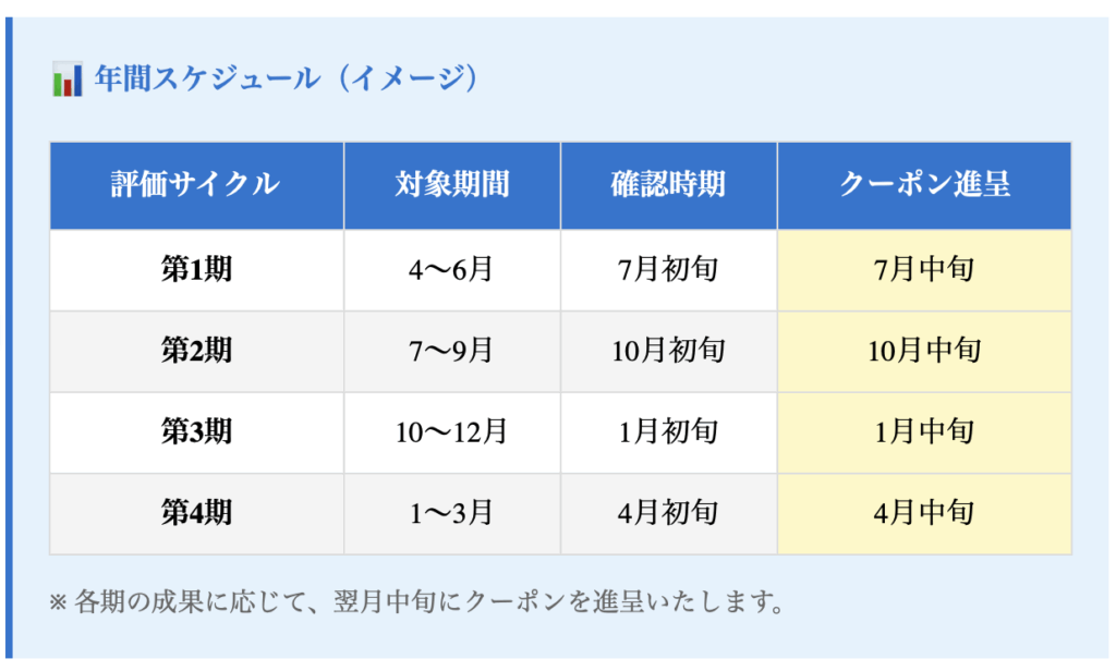 キャンペーンでは、3ヶ月ごとにご利用実績を確認します。一定の基準を満たした場合、成長度合いに応じたクーポンが進呈されます。