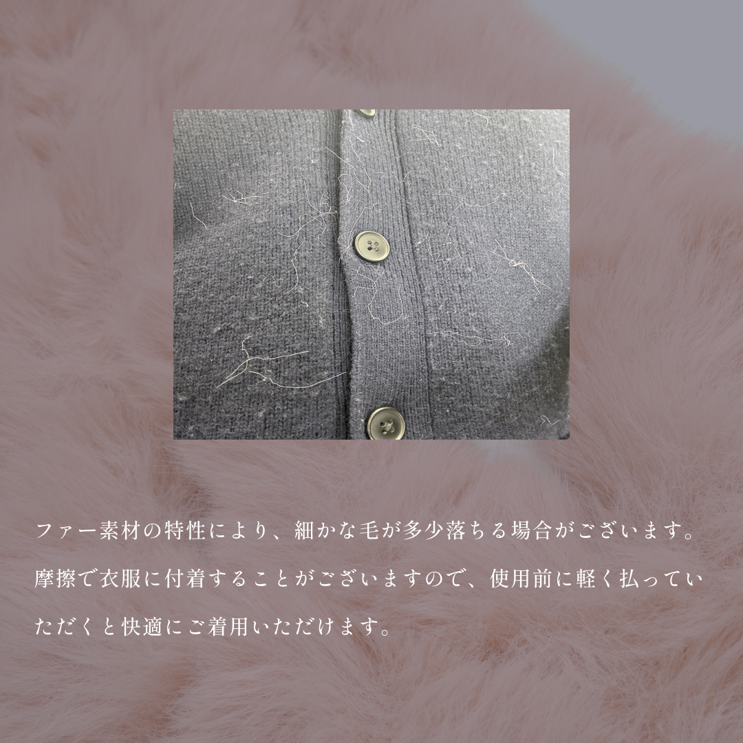 | 注意事項 | 素材特性上、細かな毛が抜け落ちる場合があります。着用前に軽く払ってください。摩擦により他の衣類に毛が付着することがあります。 火や熱で収縮したり燃えたりしますので十分にご注意ください。 |