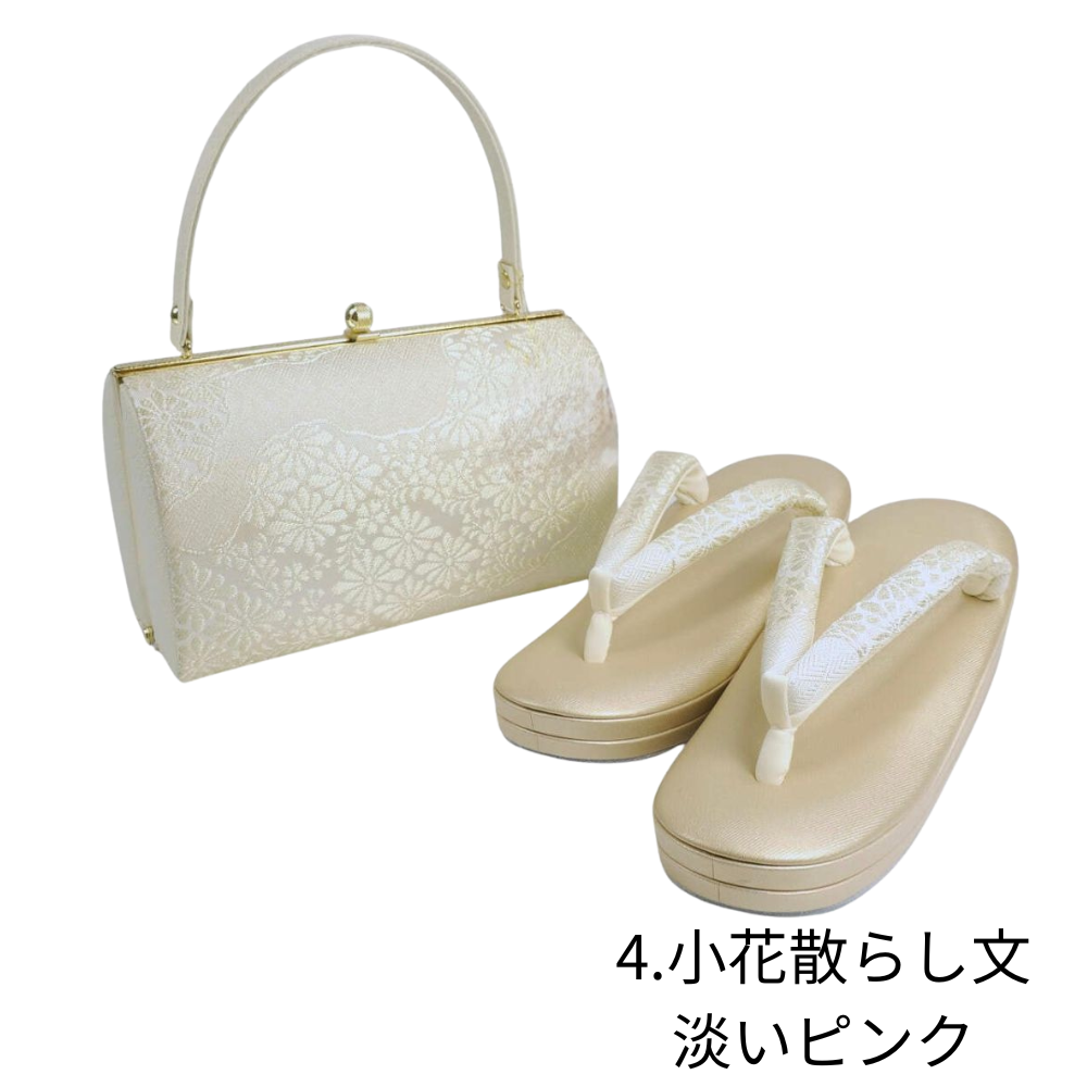 正絹袋帯地使用|留袖専用 草履バッグセット(全4柄) 黒留袖にふさわしい、格調と品位 バッグには正絹の袋帯地を使用した口金タイプを採用。 金糸・銀糸を織り込んだ上品な文様が、黒留袖の格式を引き立てます。 草履の鼻緒にも同柄の帯地を使用し、全体に統一感のある仕上がりです。 柄バリエーション(全4種類) ① 小花散らし文 ② 流水に小花文 ③ 流水花文 ④ 小花散らし文(淡いピンク系) 留袖専用設計 結婚式・披露宴・叙勲式・格式ある式典など、 第一礼装である黒留袖に安心して合わせていただけます。 履き心地と安定感 程よい高さと安定感のある三枚芯草履。 長時間の着用でも疲れにくく、立ち姿・歩き姿を美しく演出します。 |