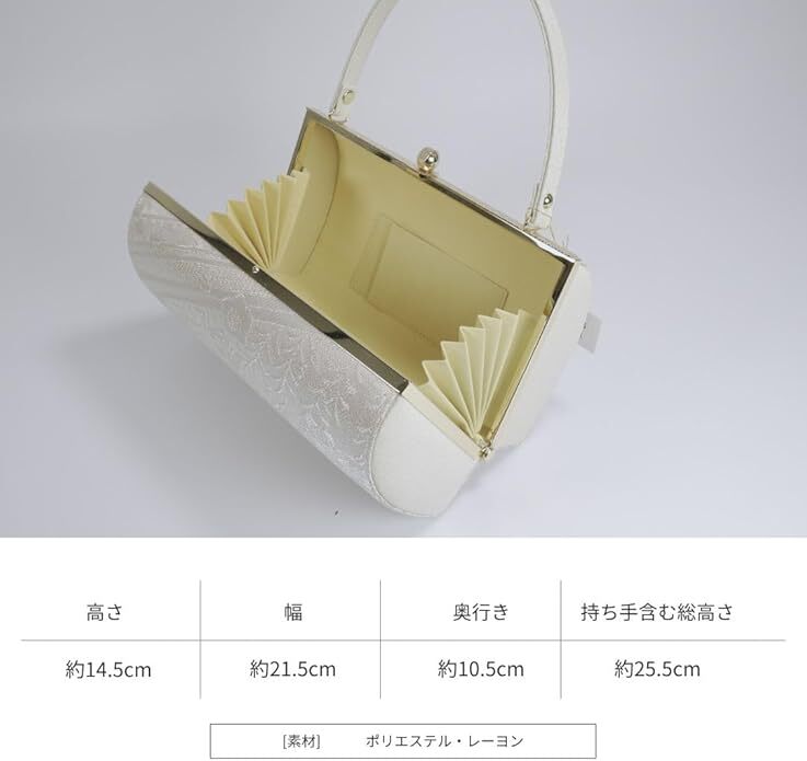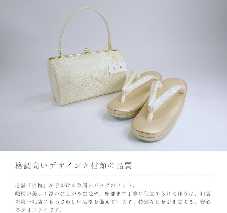 <バッグ> 高さ:約14.5cm 幅:約21.5cm 奥行:約10.5cm 持ち手含む総高さ:約25.5cm <草履> 全長:約25cm 横幅:約7.8cm かかとの高さ:約5.5cm (対応サイズ:約23.5~24.5cm) |