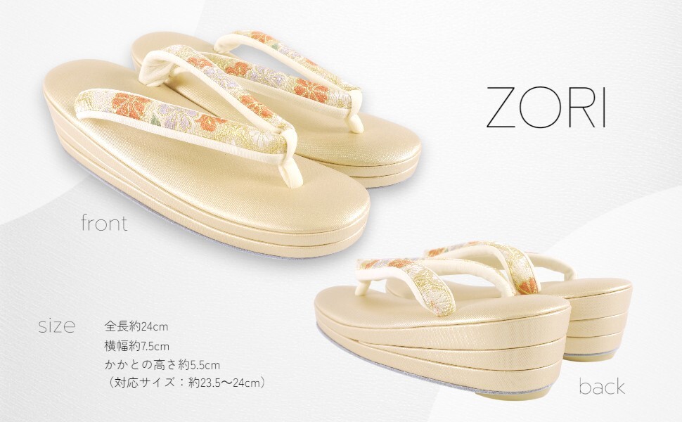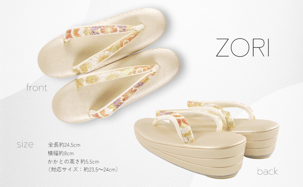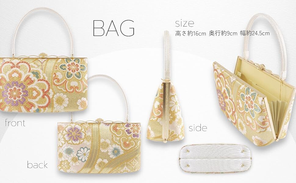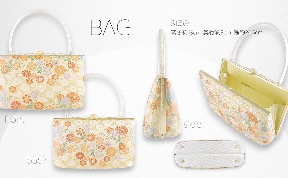 バッグ:高さ約16cm × 幅約24.5cm × 奥行約9cm 持ち手含む高さ:約25cm 草履:全長約25cm × 横幅約7.8cm × かかとの高さ約5cm (対応サイズ:約23.5~24cm) |
