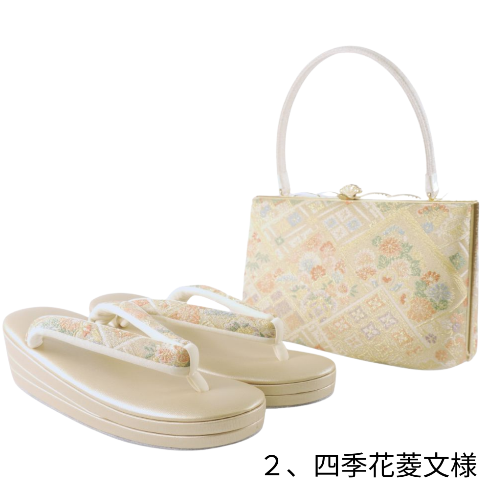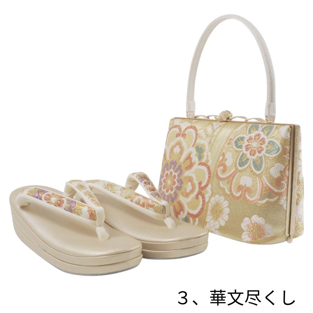 上品な艶めきと格調美。フォーマルシーンを彩る草履バッグセット(全3柄) 上質なデザインと統一感 バッグには袋帯地を使用した口金タイプを採用。 正絹ならではの艶と織の立体感が、装いに品格を添えます。 草履の鼻緒にも同柄の帯地を用い、全体に統一感と高級感を持たせています。 柄のバリエーション(全3種類) ① 花七宝文様 … 七宝地に花意匠を重ねた、やわらかで華やかな印象。 ② 四季花菱文様 … 菱取りに四季の花を配した、格調高い伝統柄。 ③ 華文尽くし … 大ぶりの華文が映える、存在感のある正統派フォーマル柄。 幅広いシーンに活躍 結婚式・入学式・卒業式・成人式・お茶会・パーティーなど、 幅広いフォーマルシーンに対応します。 用途イメージ 振袖にも使用可能。 訪問着・付下げ・色無地に合わせてセミフォーマルとしてもお使いいただけます。 特に春や秋の晴れやかな装いに映える柄付けです。 安定感ある草履 程よい高さで歩きやすく、疲れにくい設計。 上質な素材使いで、足元から気品を演出します。 |